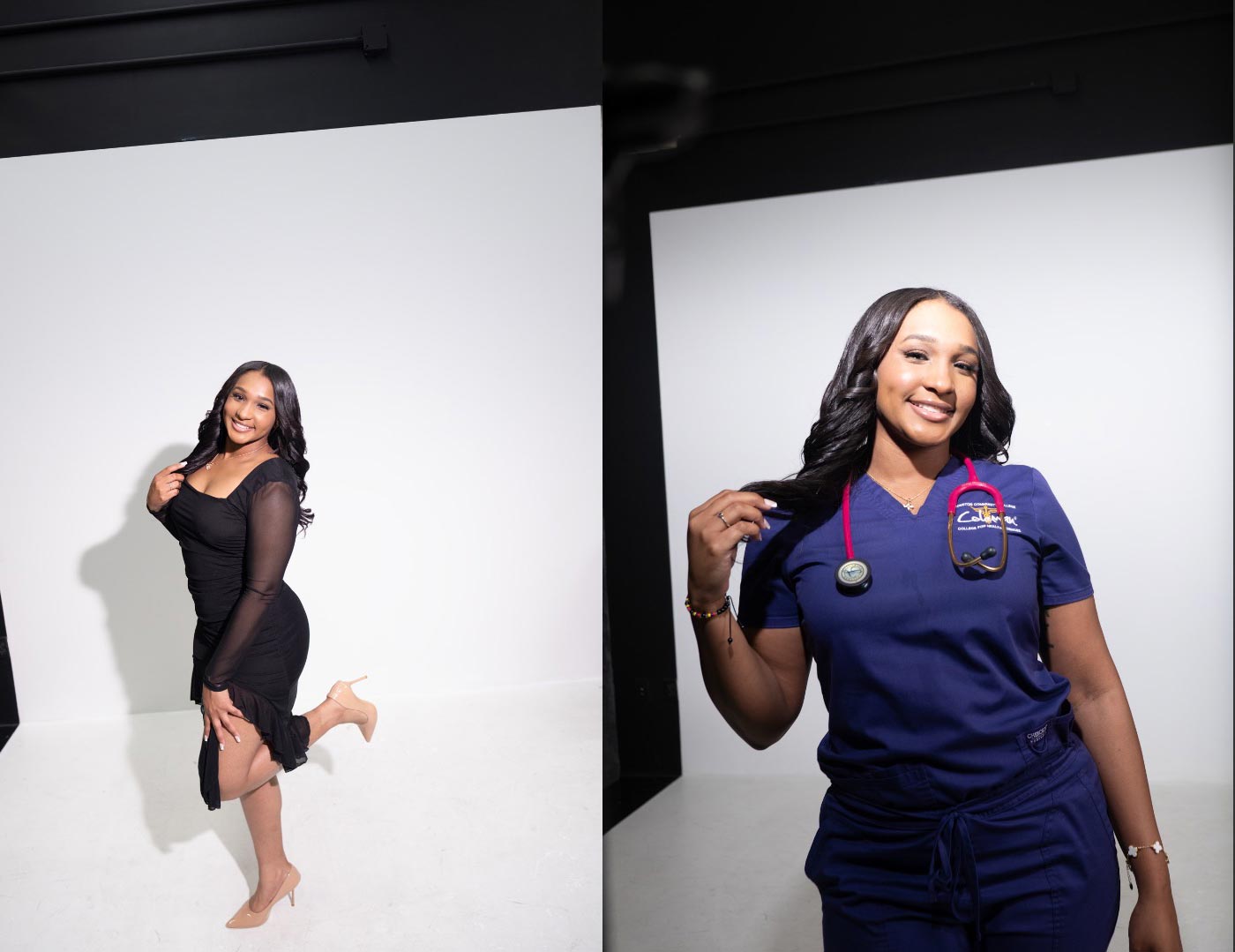 两个人的合集照,走的应该是彩妆拍摄路数,背景色也是贴合的。