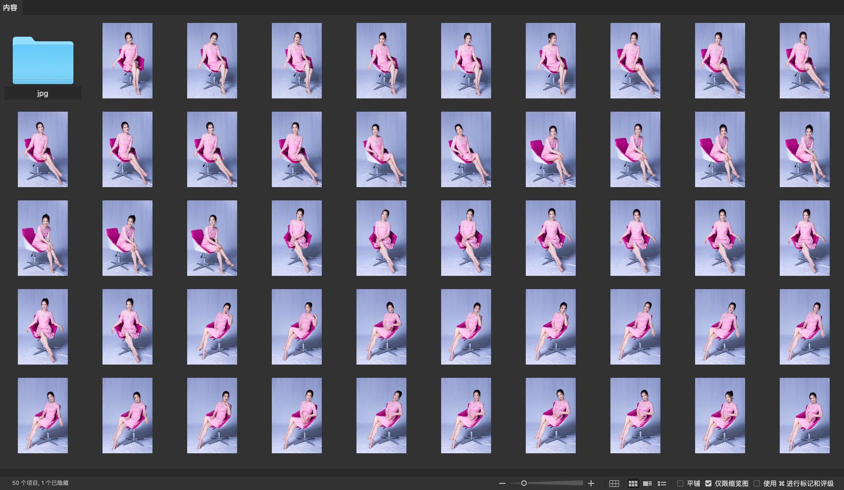 棚拍坐姿全身照片,构图重复率比较高,放大后细节不如特写镜头。