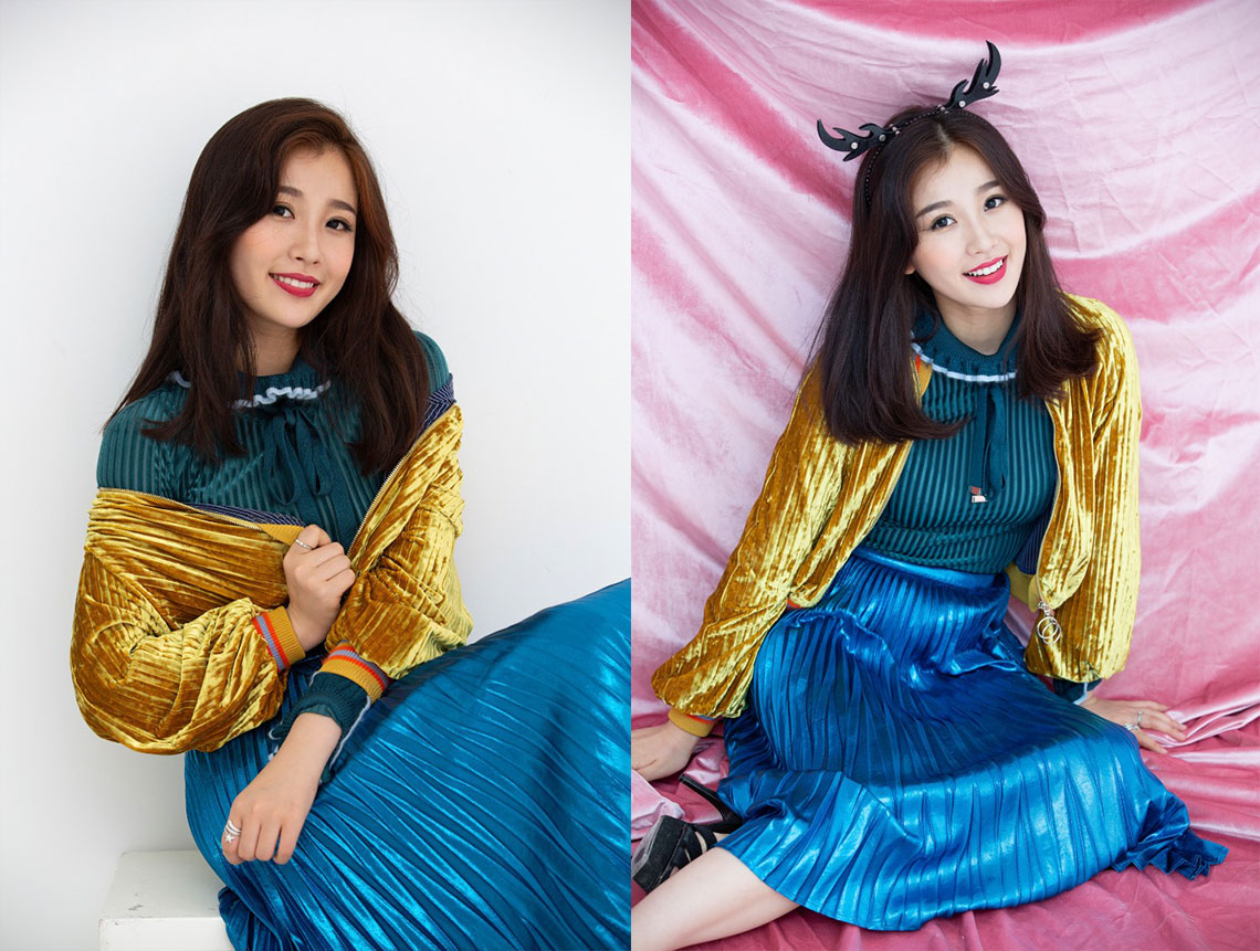 这套算是冷暖撞色搭配了吧,构图也不错,欣欣的表现力也很到位。