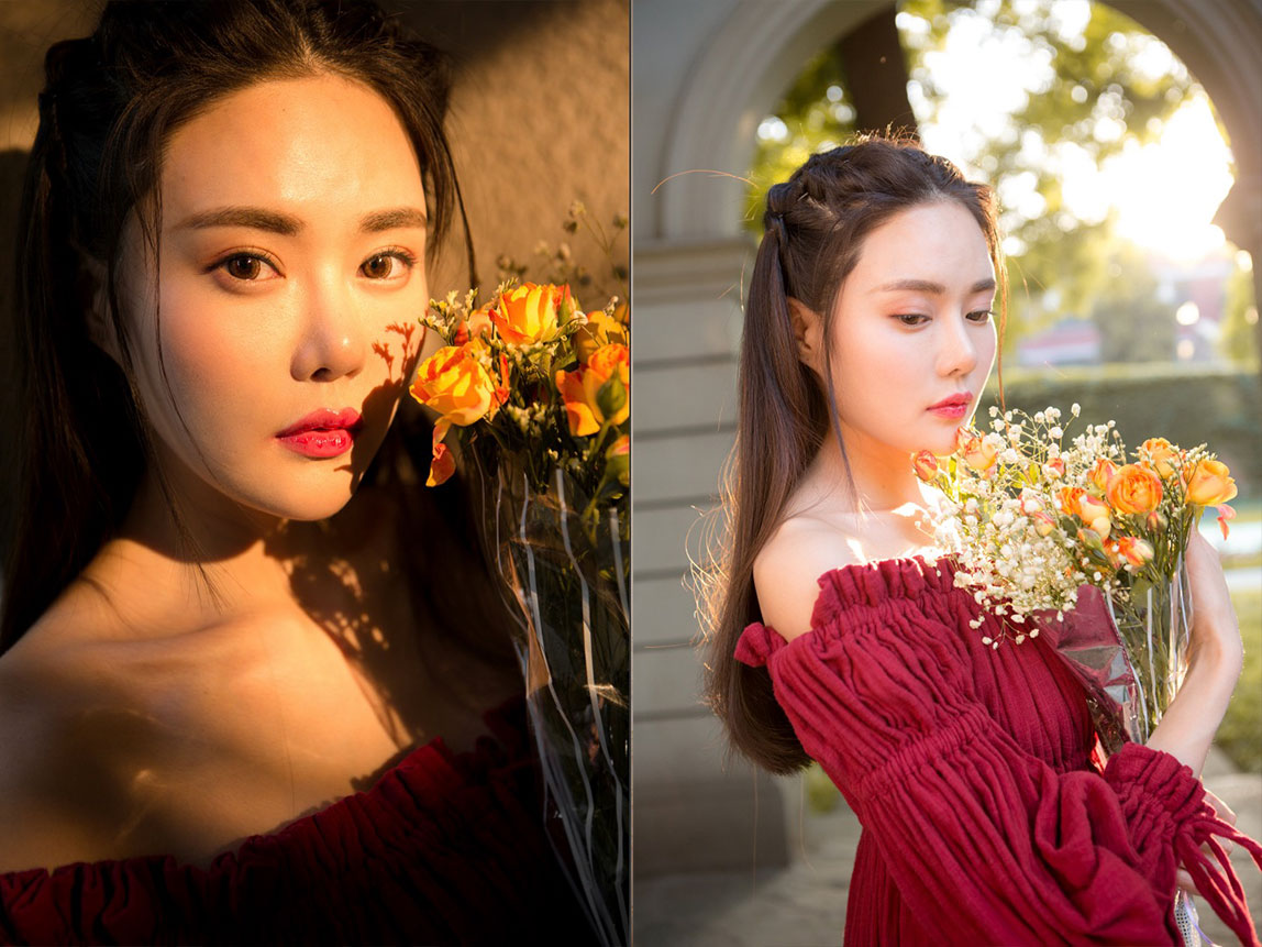 薛越心早期室内写真 人像摄影原图 红色露肩长裙