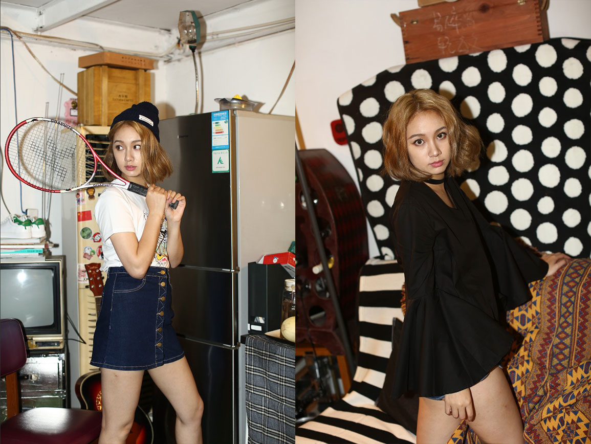 程砚秋早期居家写真照原片 一套黑外套搭配牛仔热裤和一套白短袖配牛仔短裙。