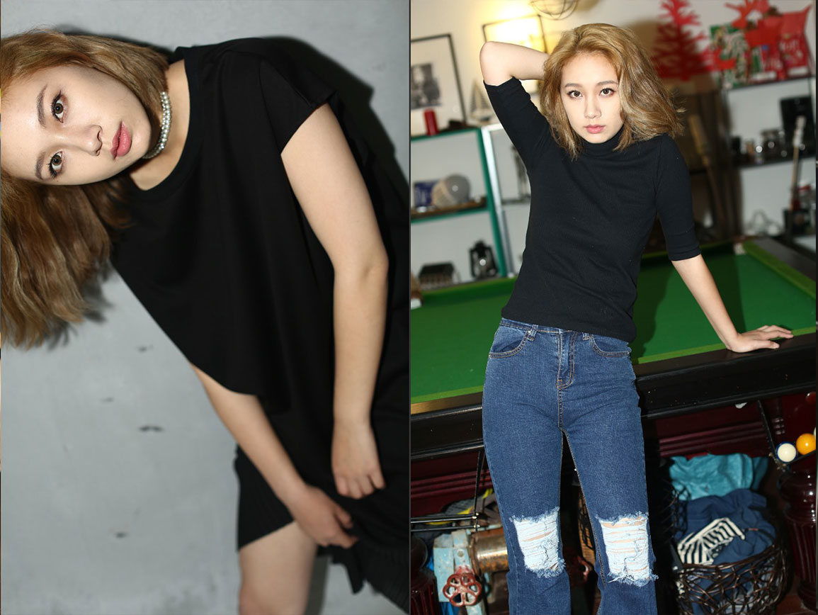 程砚秋早期居家写真照原片,一套黑色短袖配牛仔长裤,一套黑色长裙。
