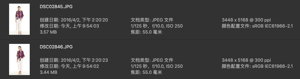 两套服装棚拍全身照,放大后细节还在,但是质感不太清晰。