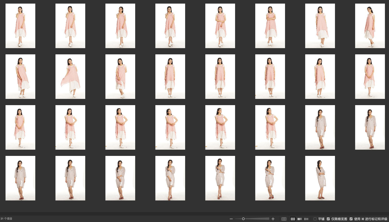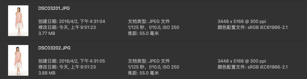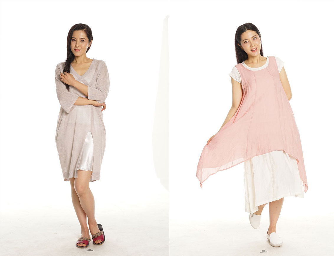 两套服装棚拍全身照,放大后细节还在,但是质感不太清晰。