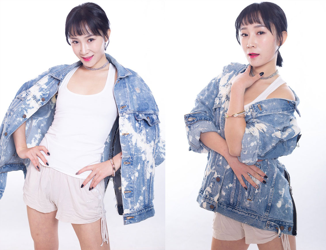 赵诗朦早期棚内拍摄宣传照原图素材 短裤背心牛仔外套