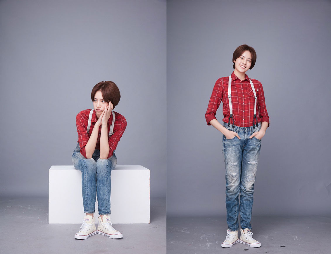 张艺上早期棚内拍摄宣传照原图素材 红格子衬衣背带牛仔裤