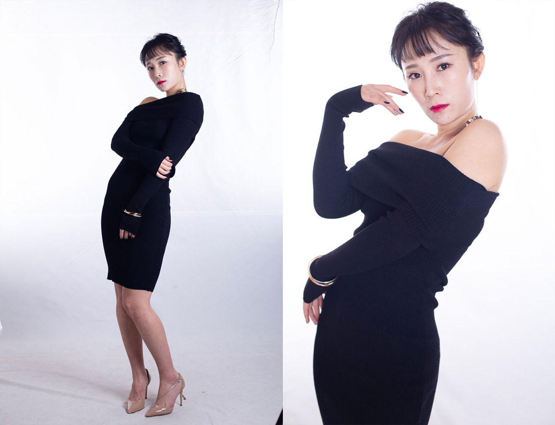 赵诗朦早期棚内拍摄宣传照原图素材 黑色露肩包臀裙