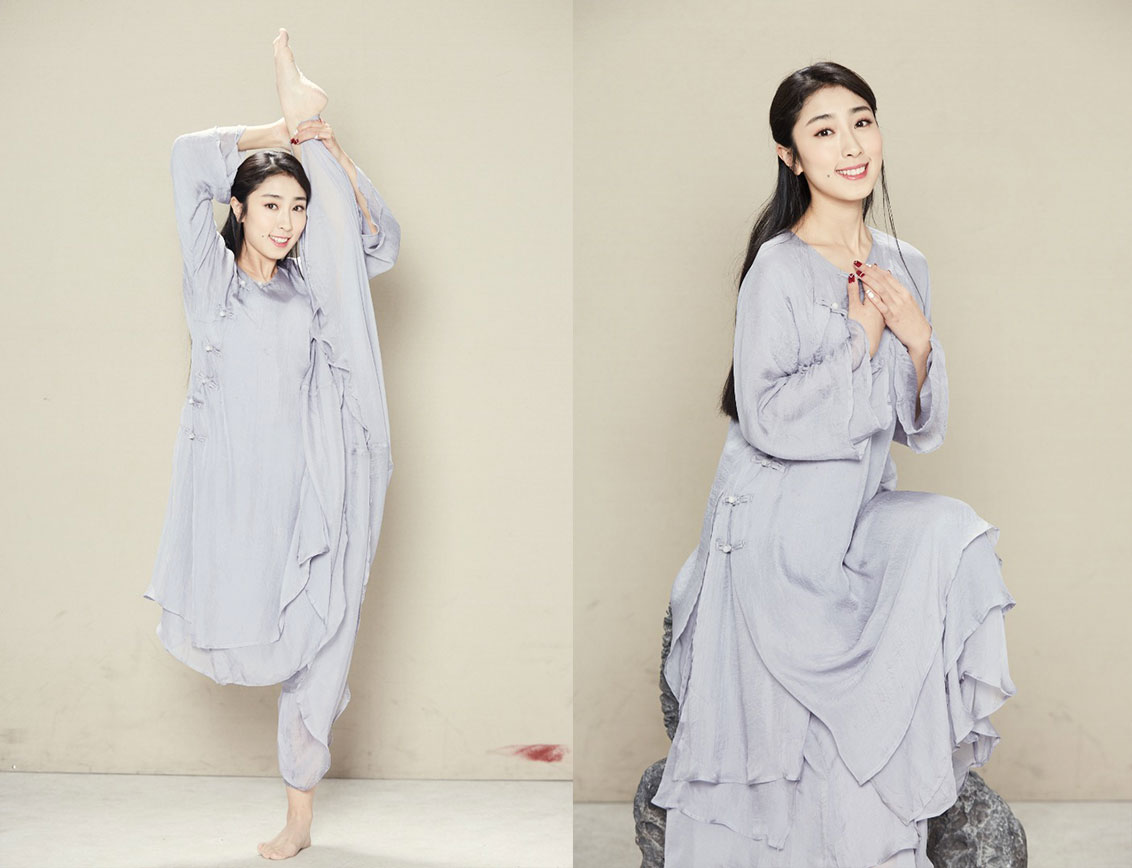 张小婉早期棚内拍摄宣传照原图素材 古装长衫站立一字马