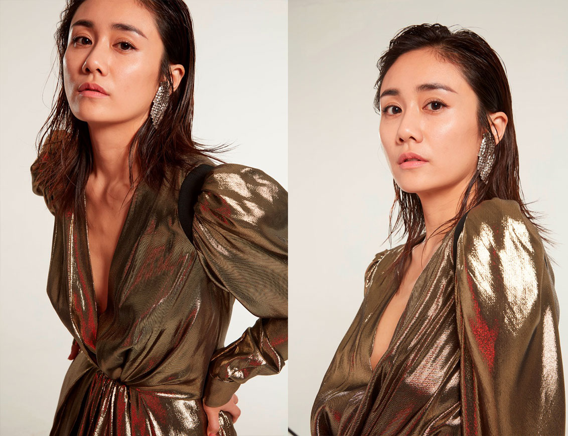 刘芸早期棚内拍摄宣传照原图素材 亮金外衣配黑色短裤