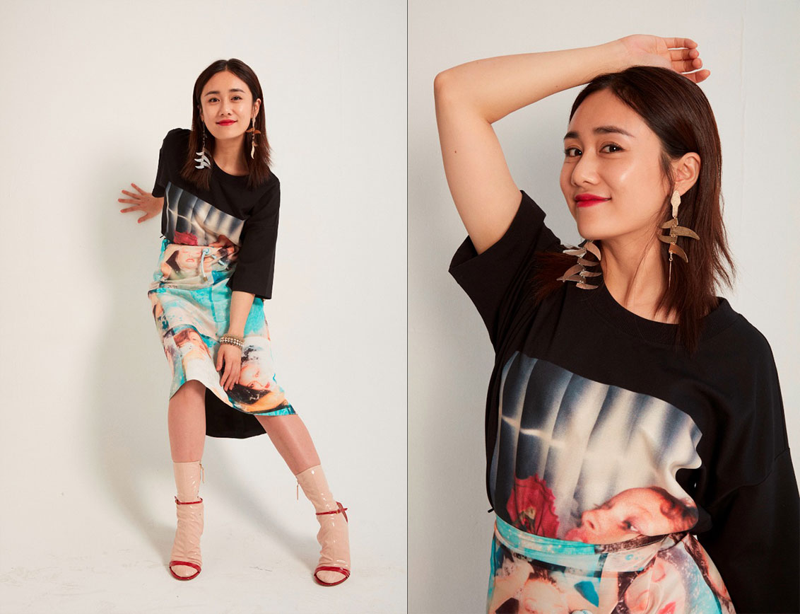 刘芸早期棚内拍摄宣传照原图素材 黑色彩印连衣裙