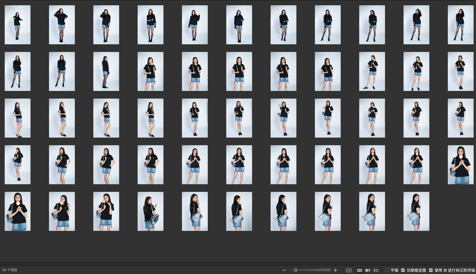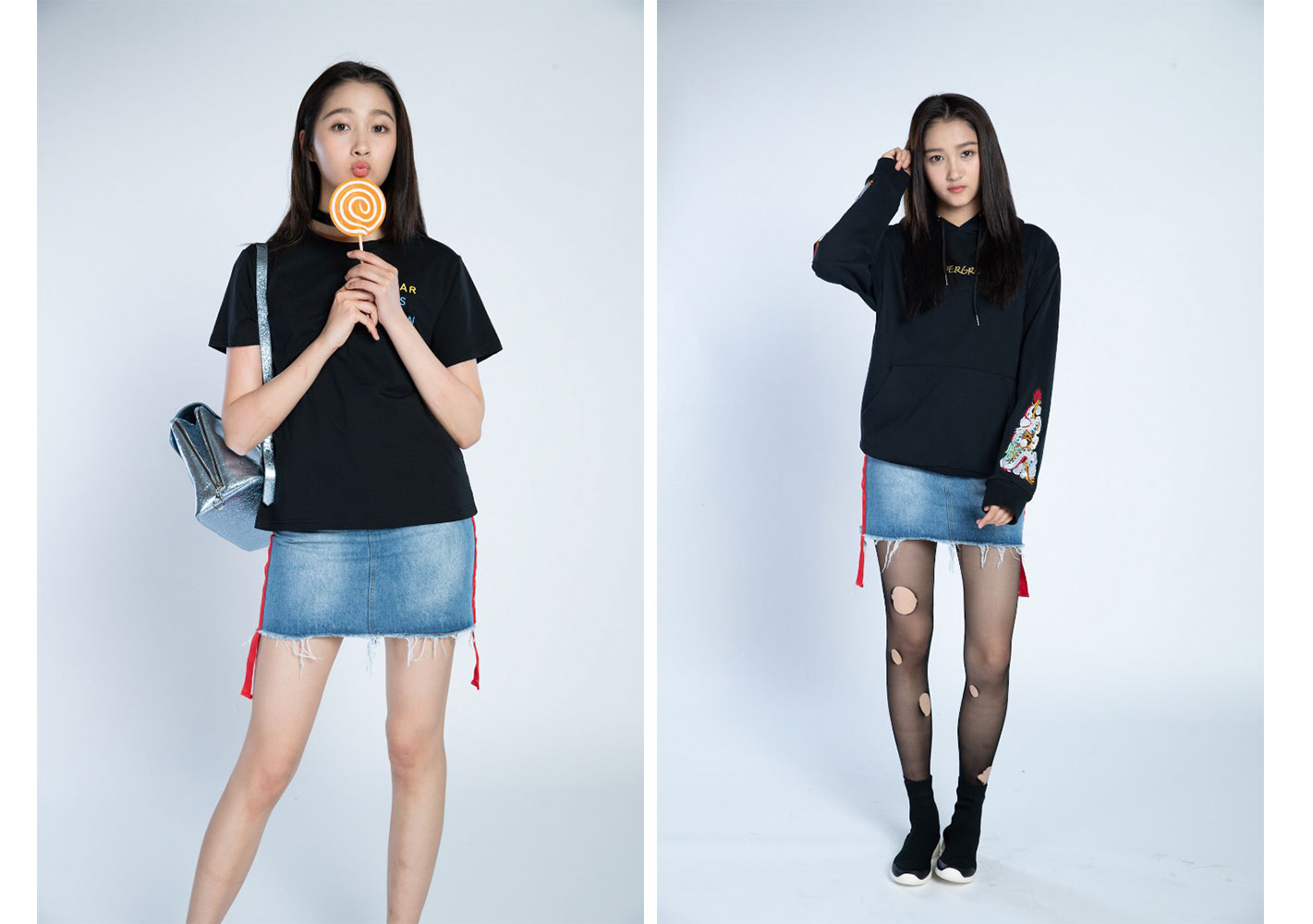 一套长袖和一套短袖搭配牛仔短裙的棚拍照片素材。