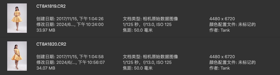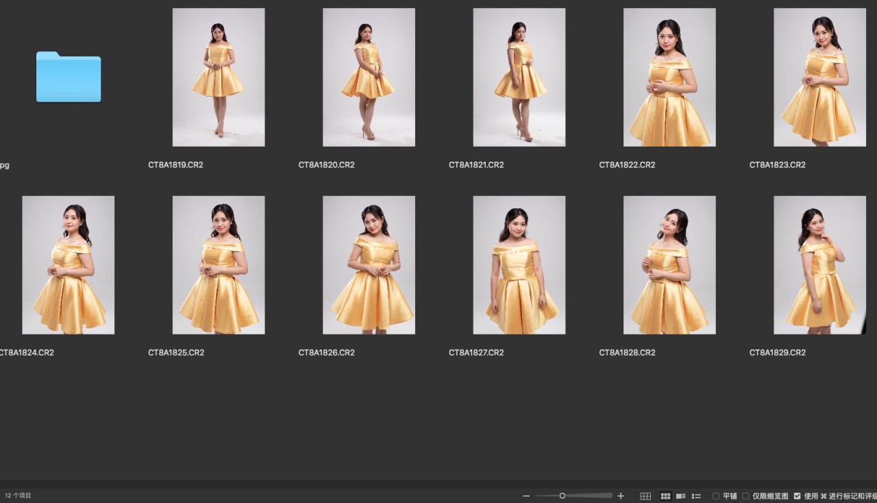 早期棚拍 黄色连衣裙未修原图,cr2格式,分辨率正常,感光度正常。