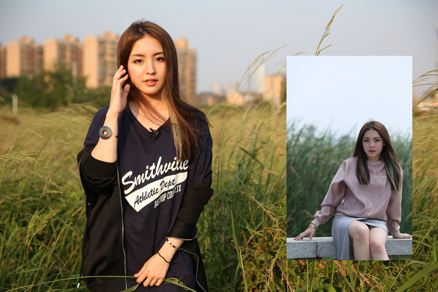 两组户外拍摄的宣传照, 黑色 T恤这组表现力很棒,另一组略差。