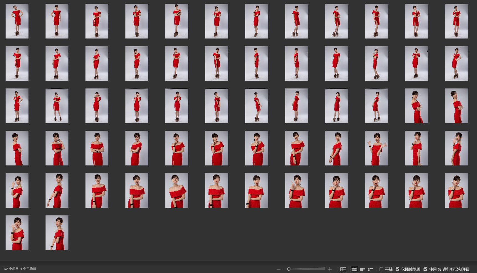 灰色背景,全身和半身特写构图,曝光度稍低。