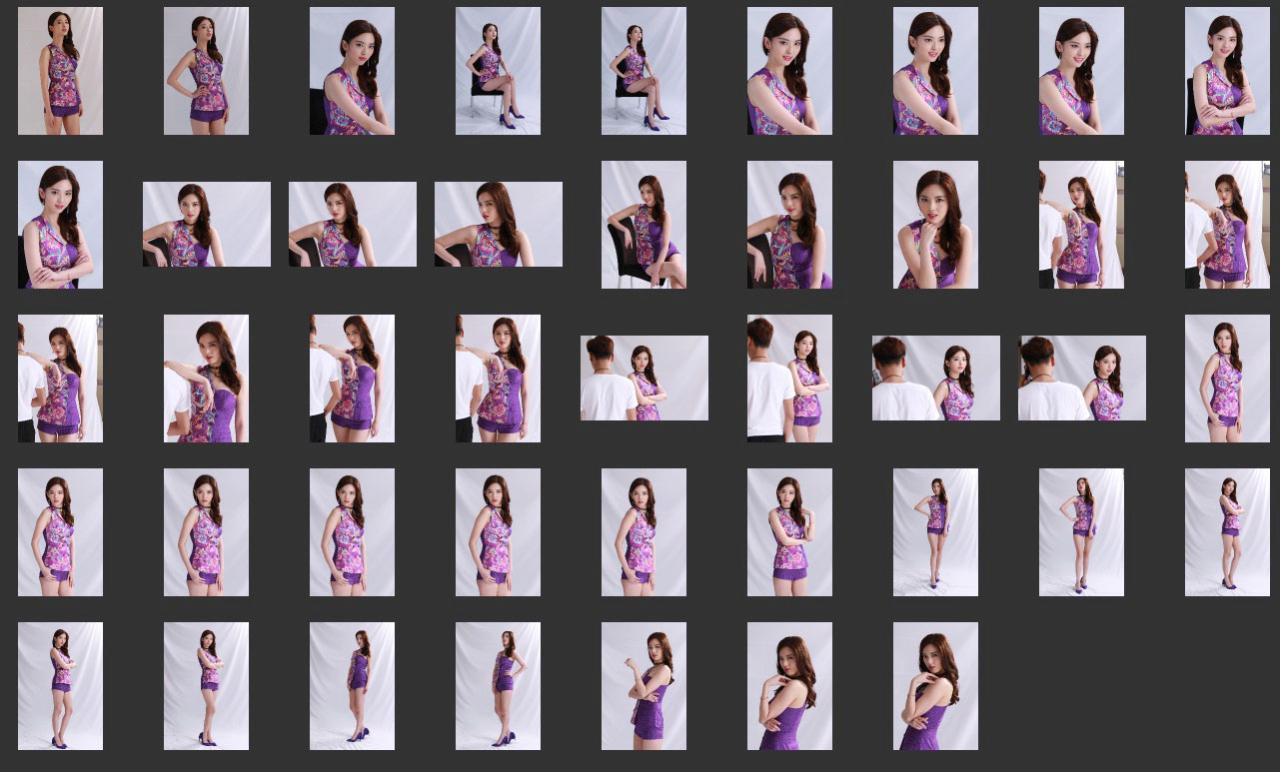 这组是白色帘子为背景,紫色服装,构图比较丰富,全身、半身、特写都有。