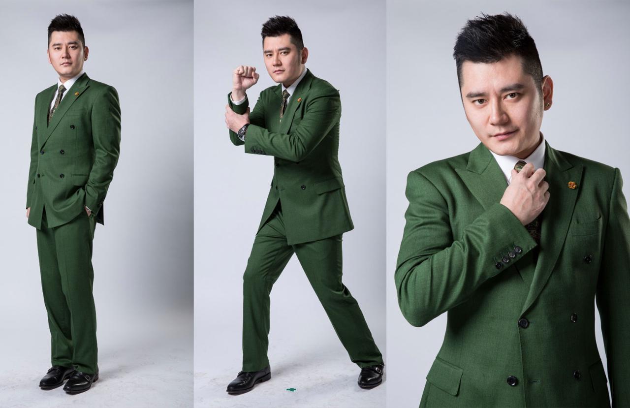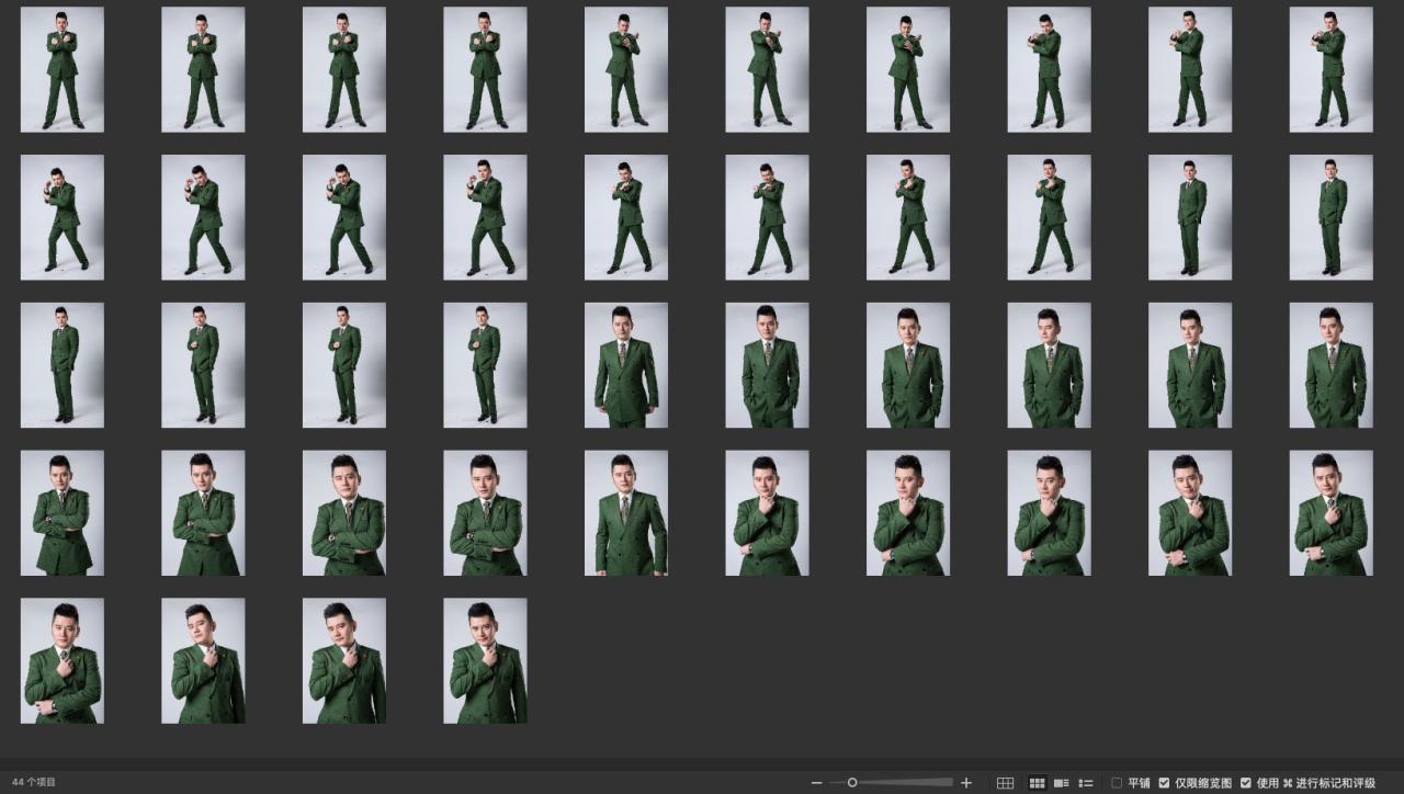 灰色背景,就是绿色西服有点不常见了,身体稍微有些僵硬,细节半身构图更丰富