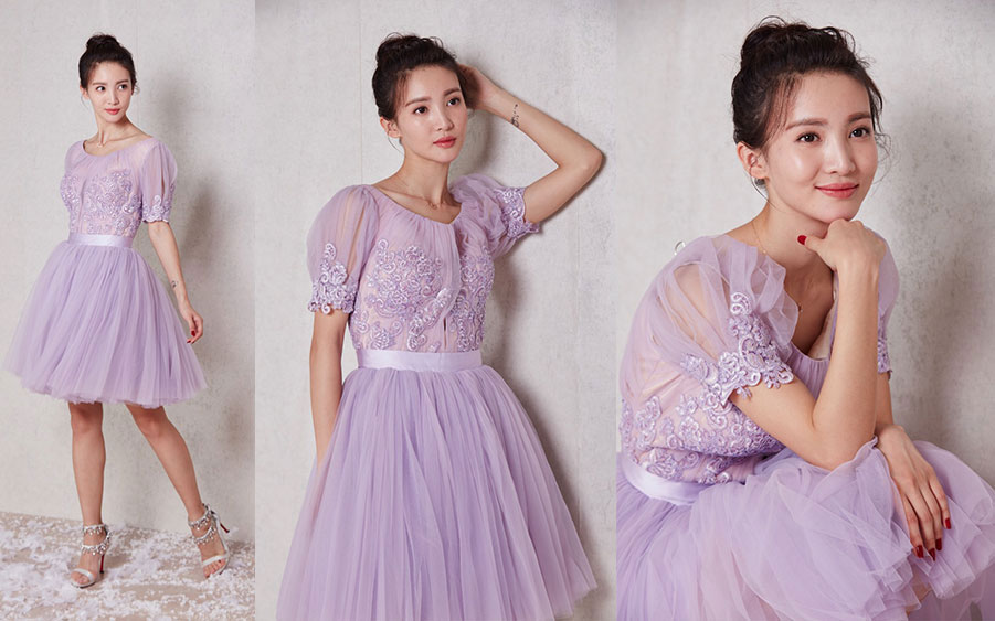 演员金晨棚拍照片紫色纱裙,人像精修练习素材。