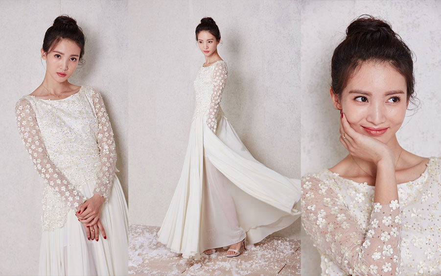 演员金晨棚拍照片白色碎花裙子,人像精修练习素材。