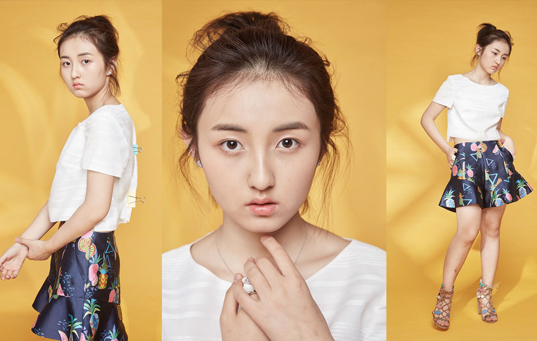 中国内地女演员张子枫早期黄色背景棚拍,人像精修练习素材。