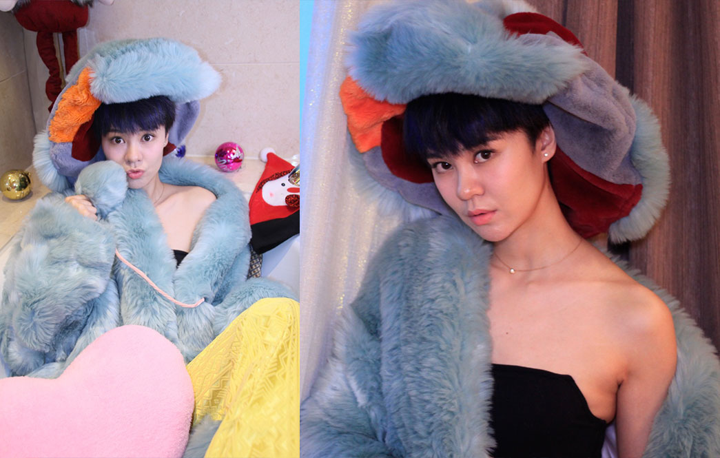 中国内地女歌手郁可唯酒店拍摄可爱的毛茸茸,人像精修练习素材。