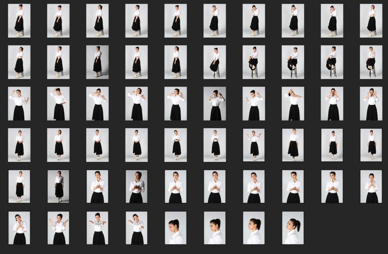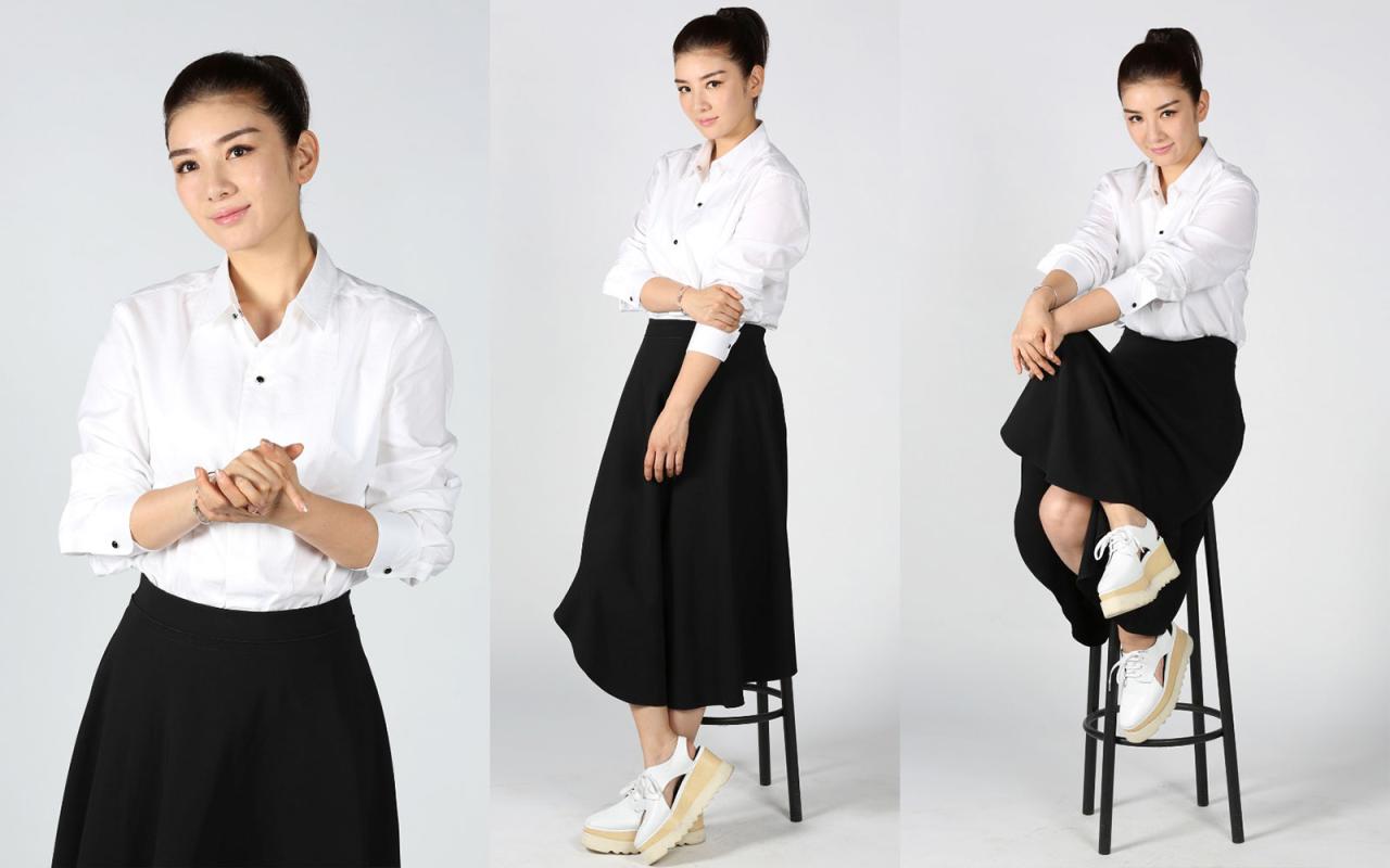 本组白色背景,服装是干净的白色上衣配黑色裙子,构图以全身和半身为主。