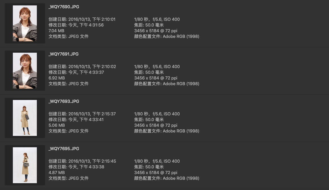 本套片子属于服装拍摄类型,三套衣服为一组,构图以全身和半身为主,全身放大后质感稍差。