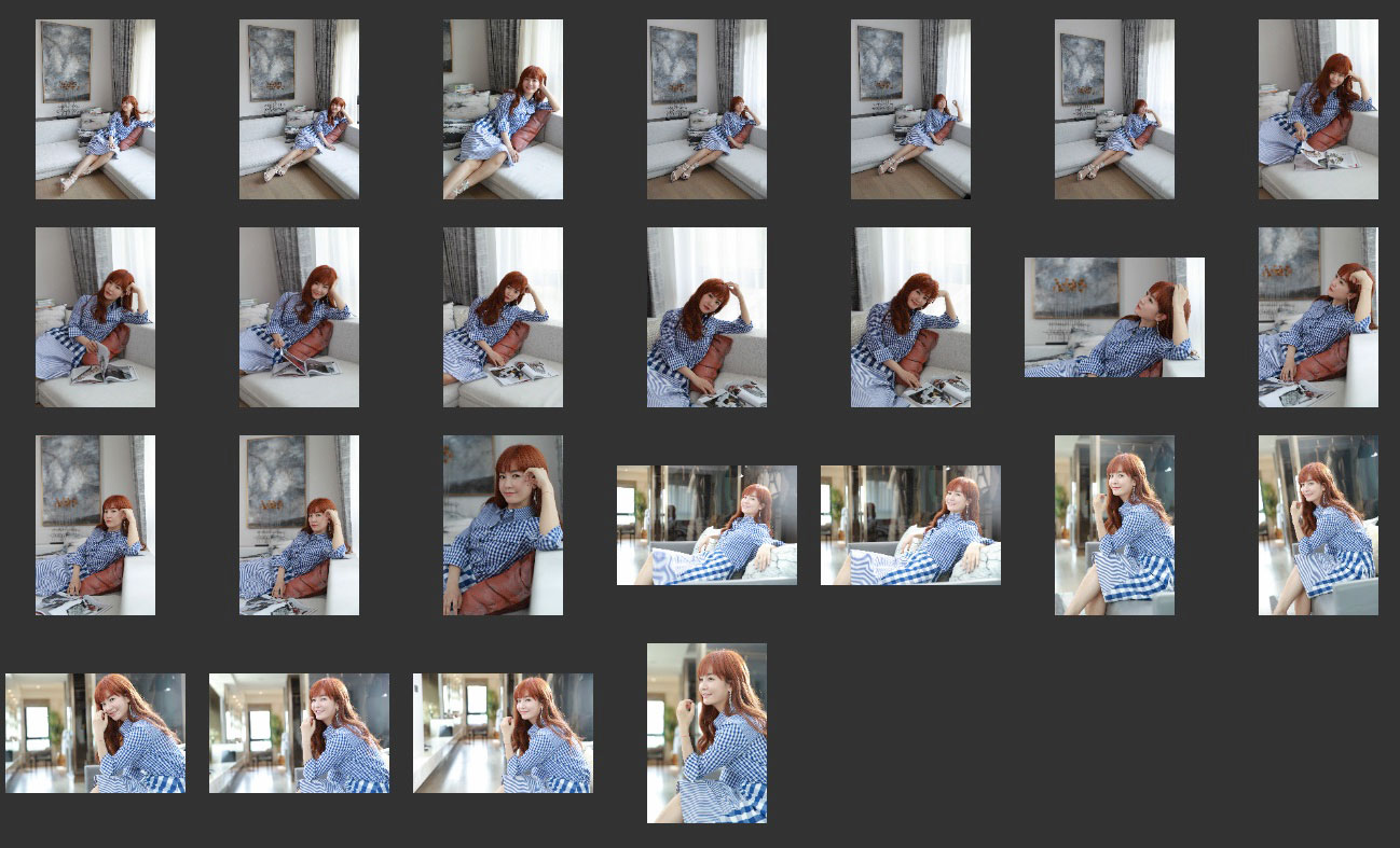 本组由一套服装拍摄构成,构图以全身和半身为主,主要是坐着的姿势,比较慵懒放松。放大后质感不错。