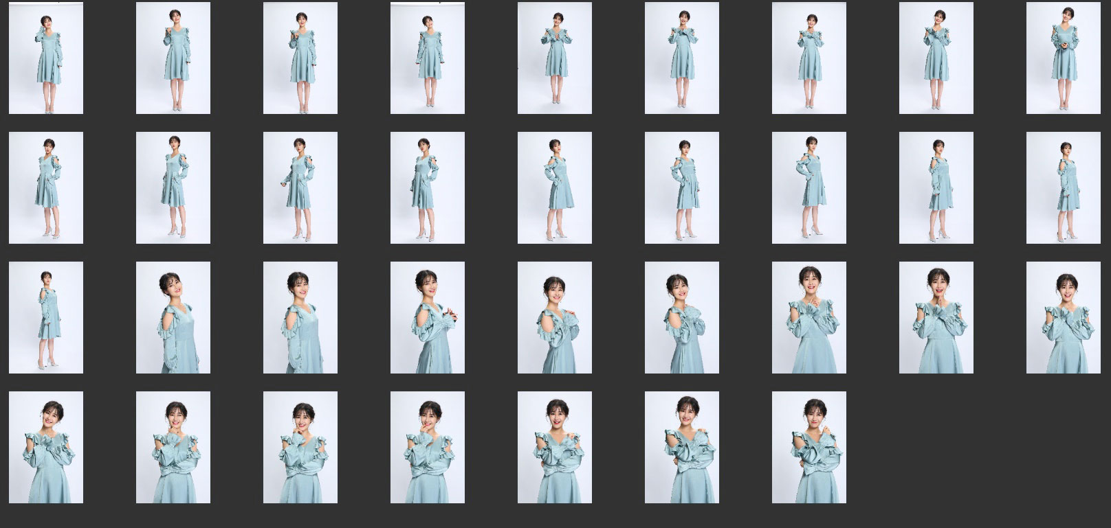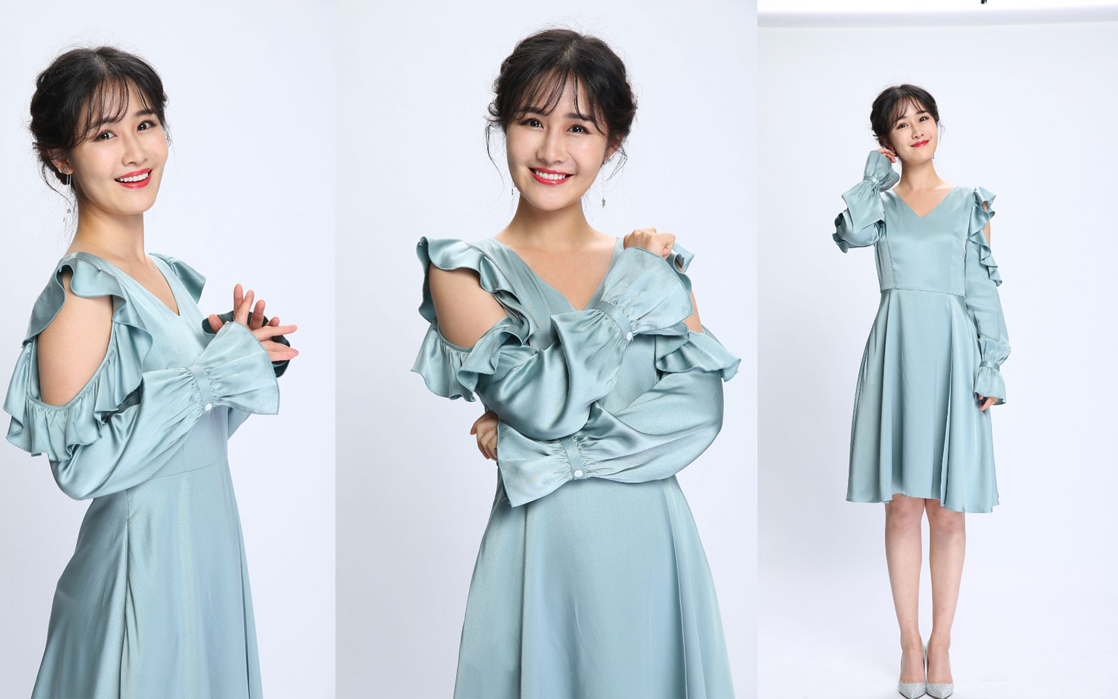 本组背景偏青色,服装也是偏青色,构图主要是全身和大半身照。