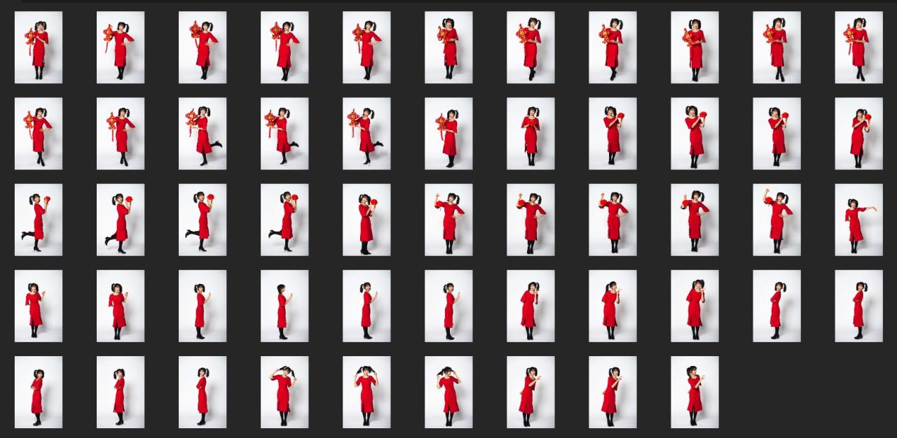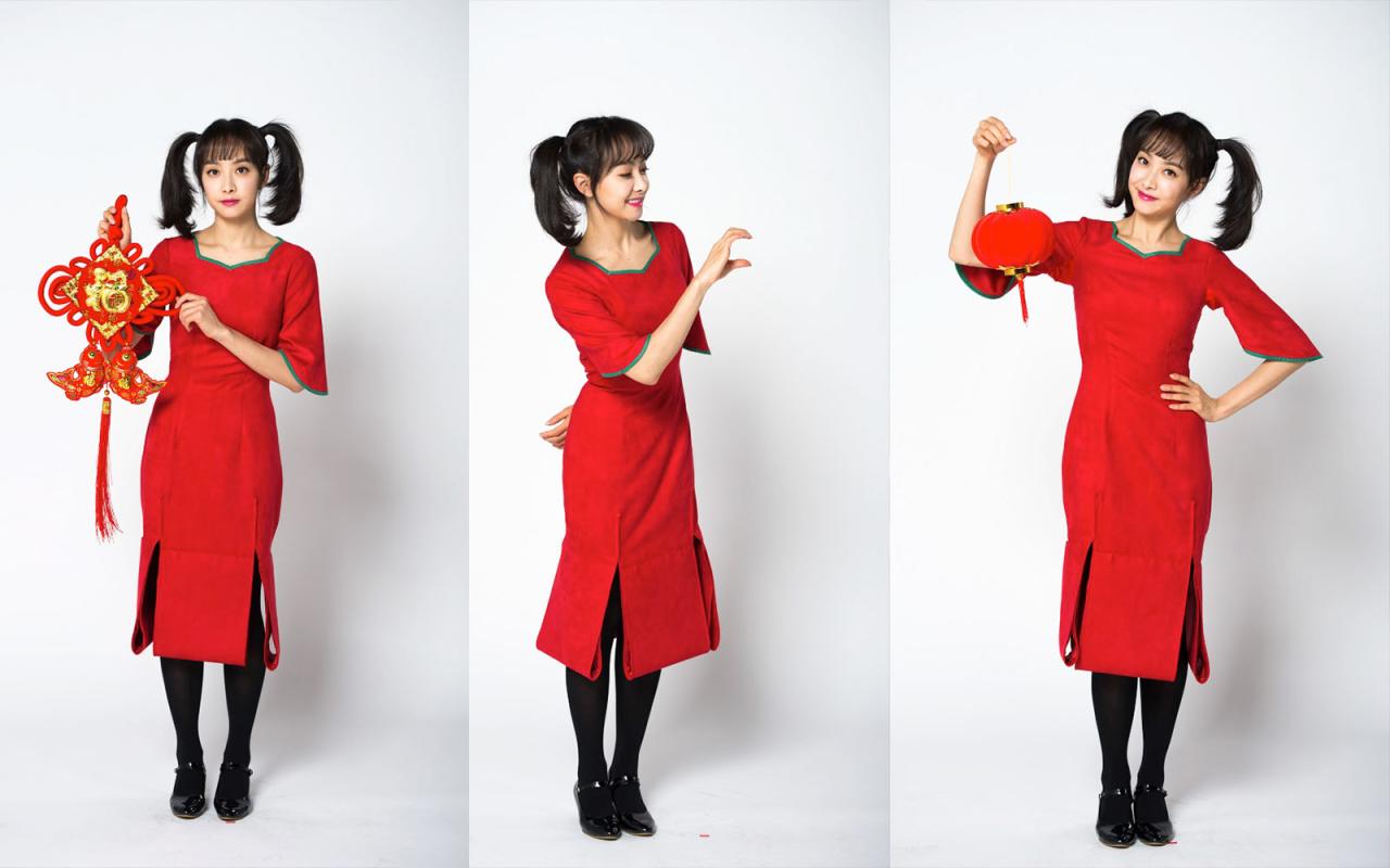 一组红红火火的拜年装扮,全身构图,放大后脸部质感和细节不足。