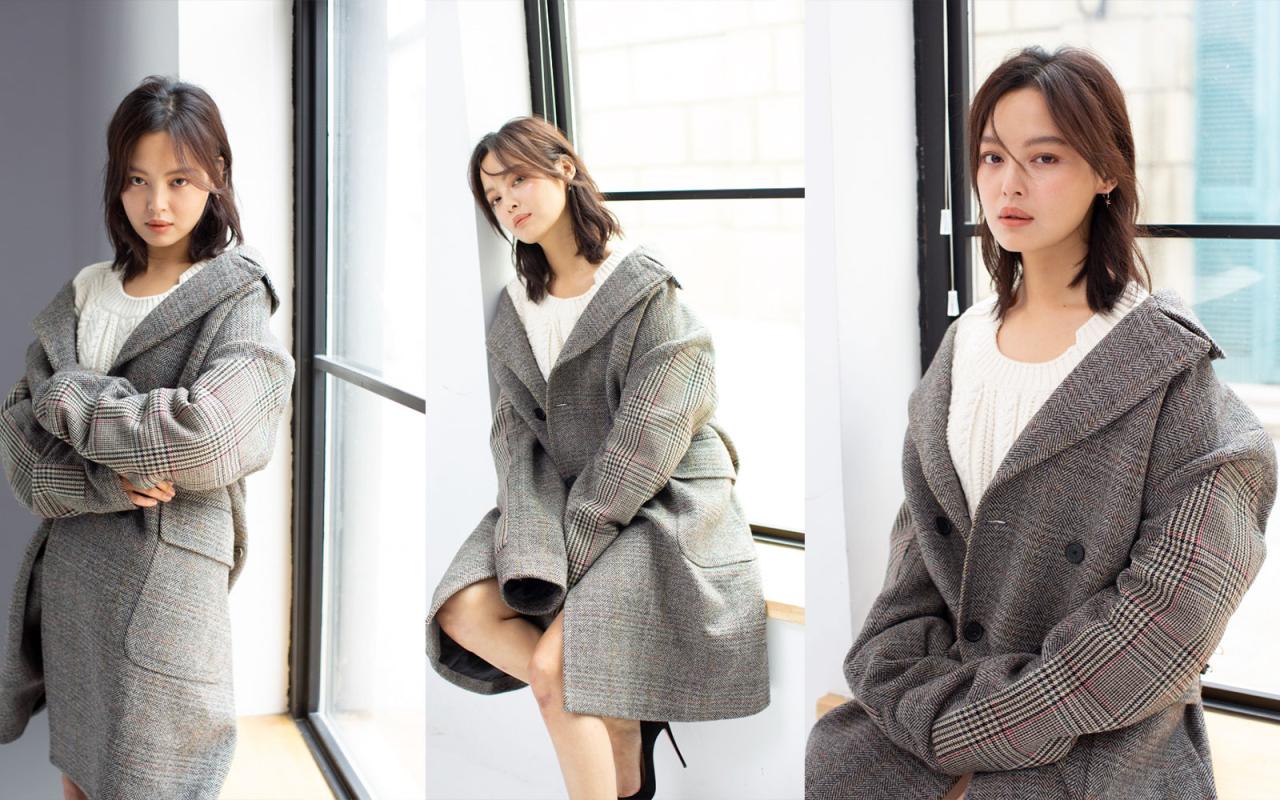 人像修图素材 辛芷蕾早期棚内拍摄 CR2格式未修原图 条纹大衣外套