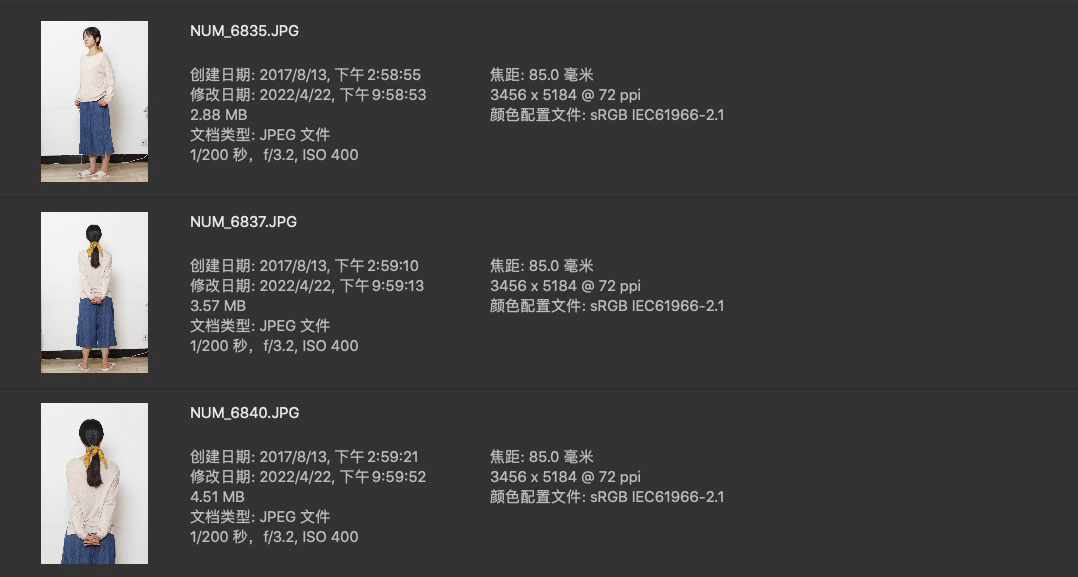 本合集三套服装,属于服装摄影范畴,所以主要是看衣服,人像次之。