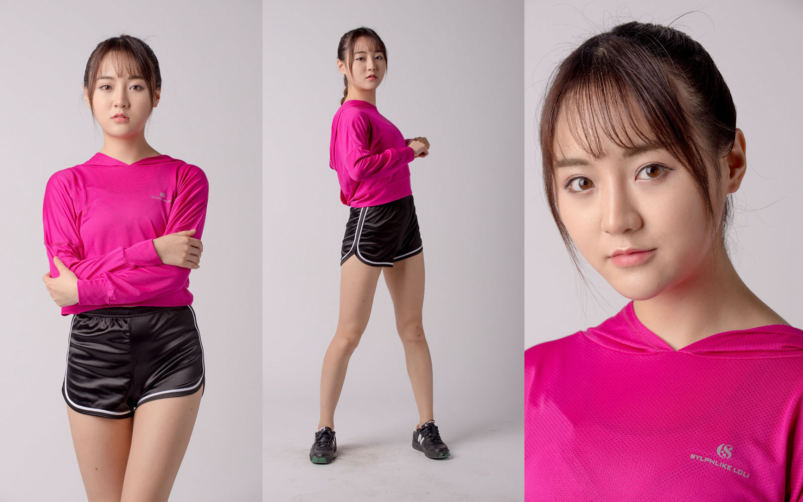 人像修图练习素材 莫寒棚拍JPG格式未修原图 玫红色运动装