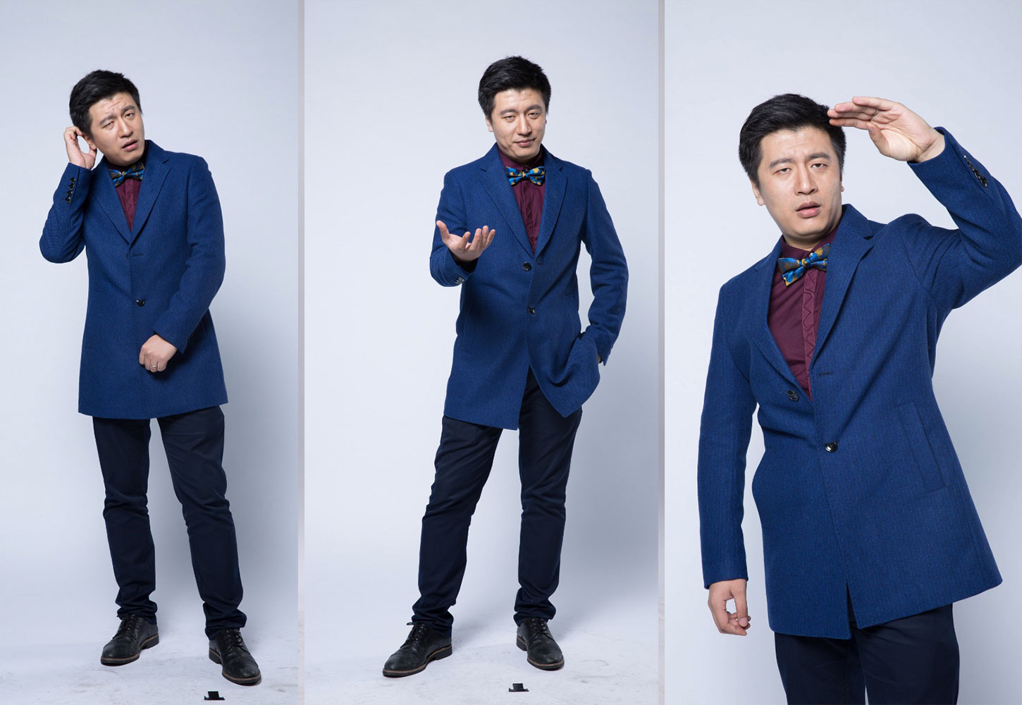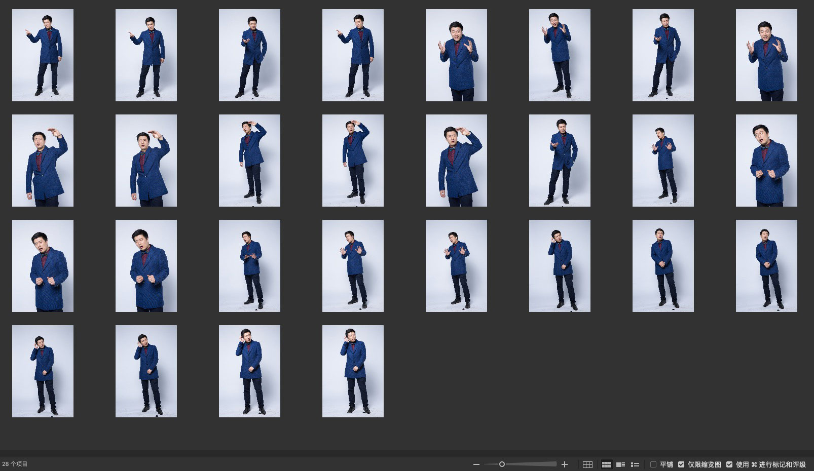 灰色背景,蓝色西服配黑色裤子,有全身有大半身,修图应该是够了