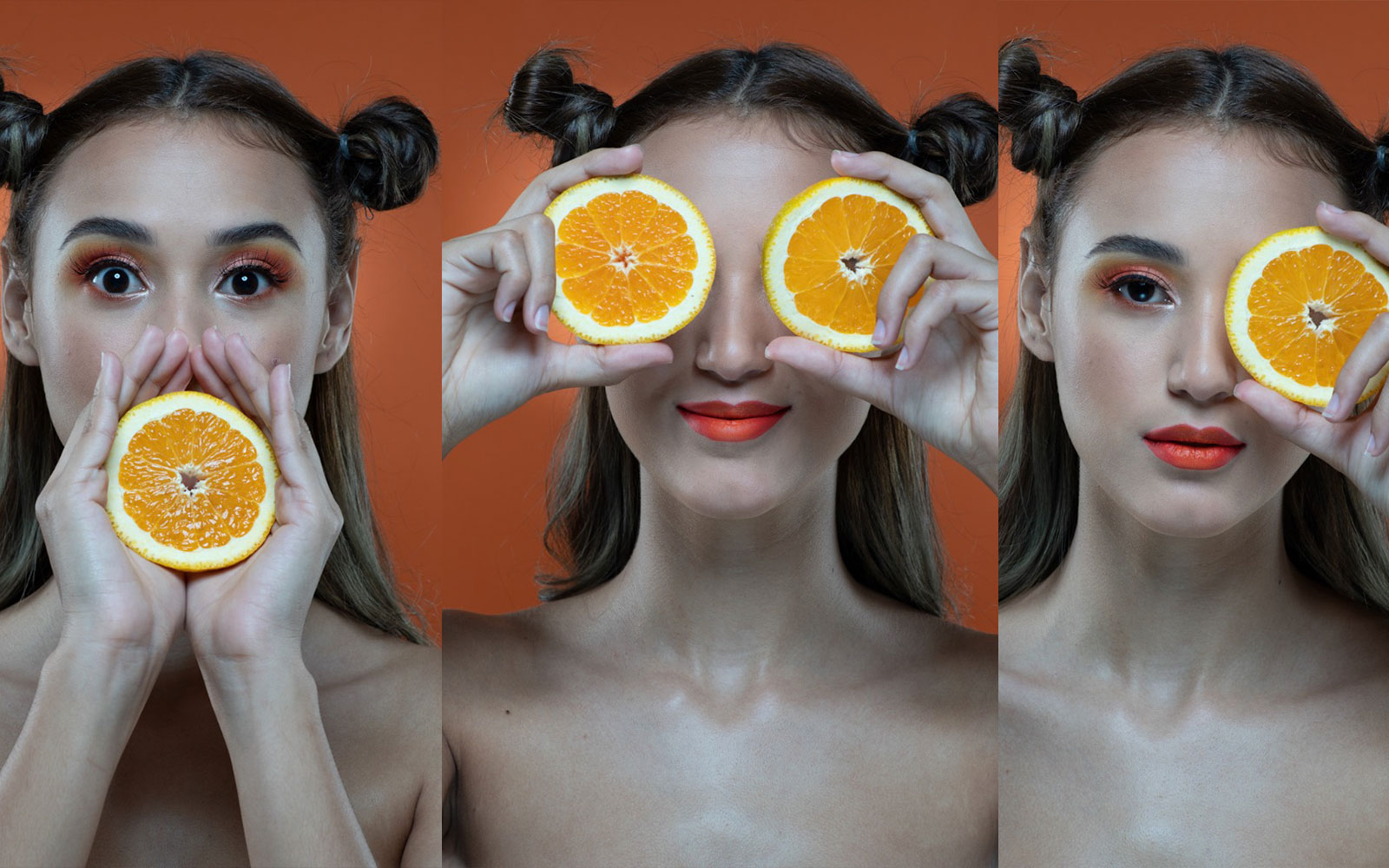 三张面部特写镜头,有些眼妆和唇妆,配上橙色橙子,精修加调色了。