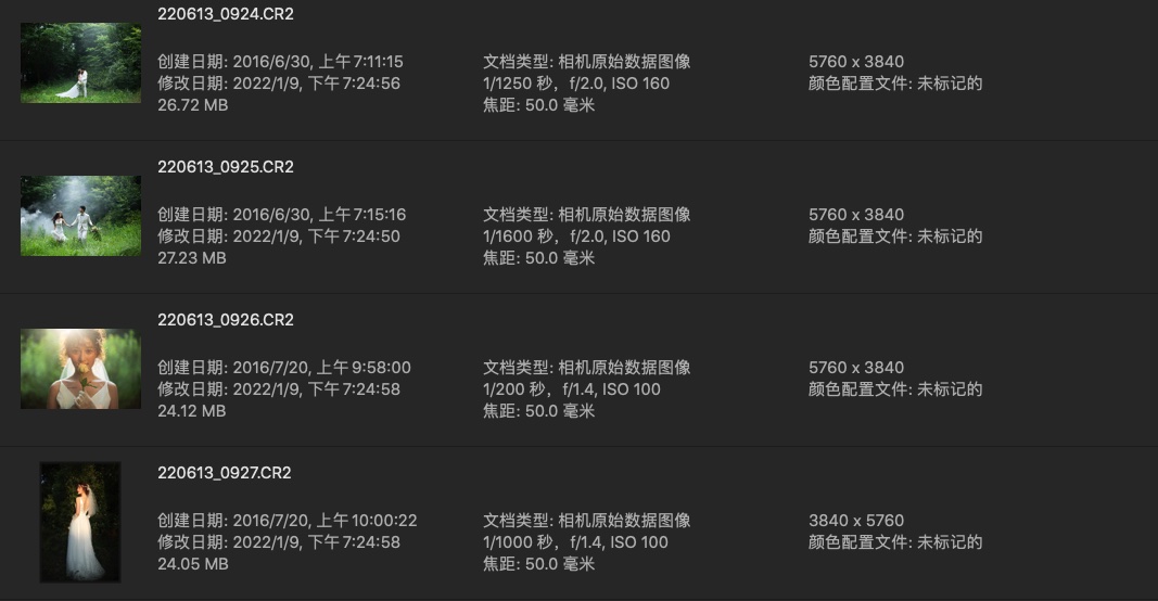森林系婚纱类型未修调照片, CR2格式,分辨率感光度 正常。