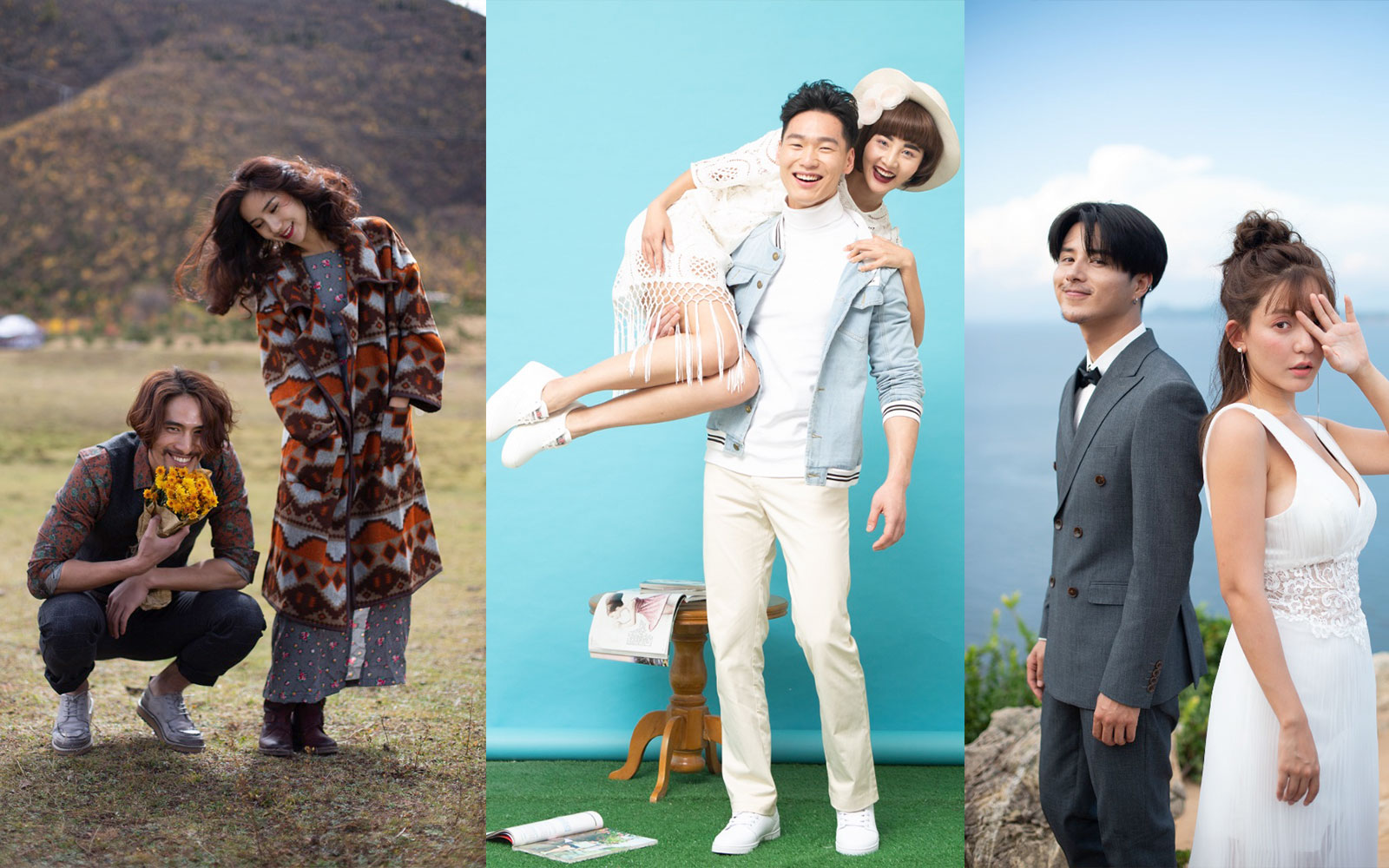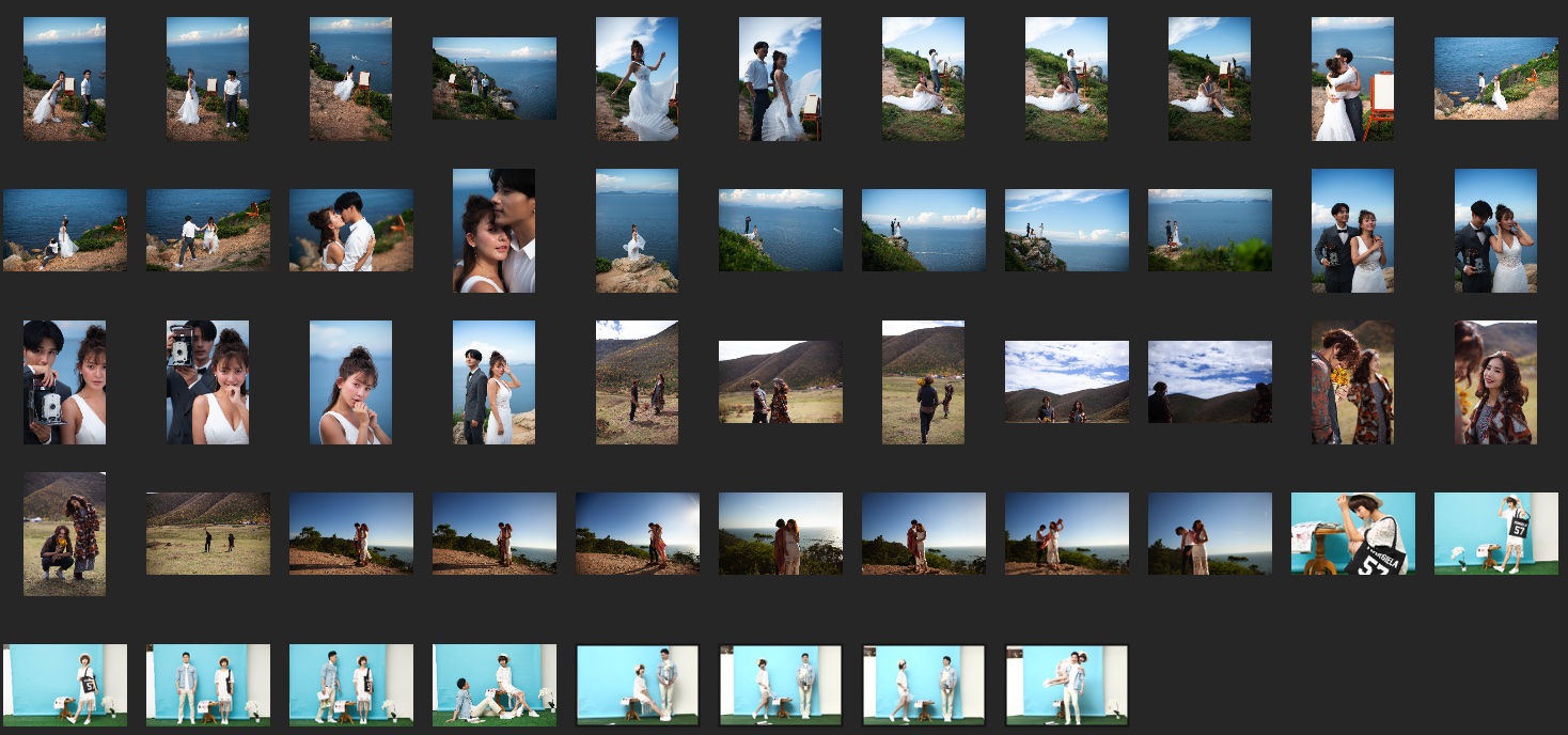 多组合集,主要是海边婚纱样片,外加一套棚内纯色背景照,放大后质感还好。