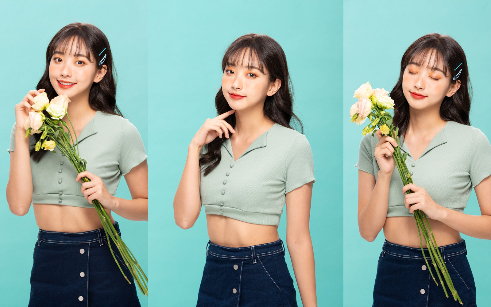 本组为青色背景,性感短衫,半身和特写构图,质感细节超级优秀。