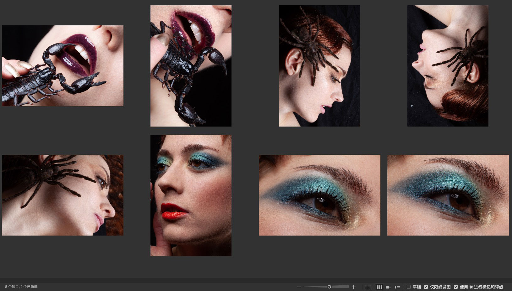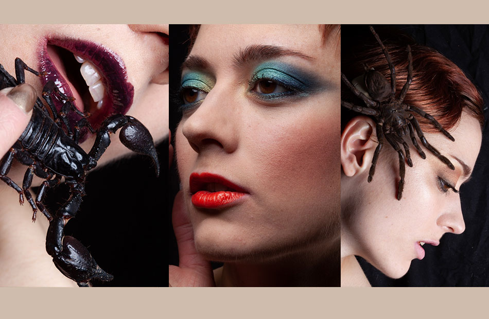 棚拍面部特写,有蜘蛛和蝎子道具,还有眼妆拍摄。